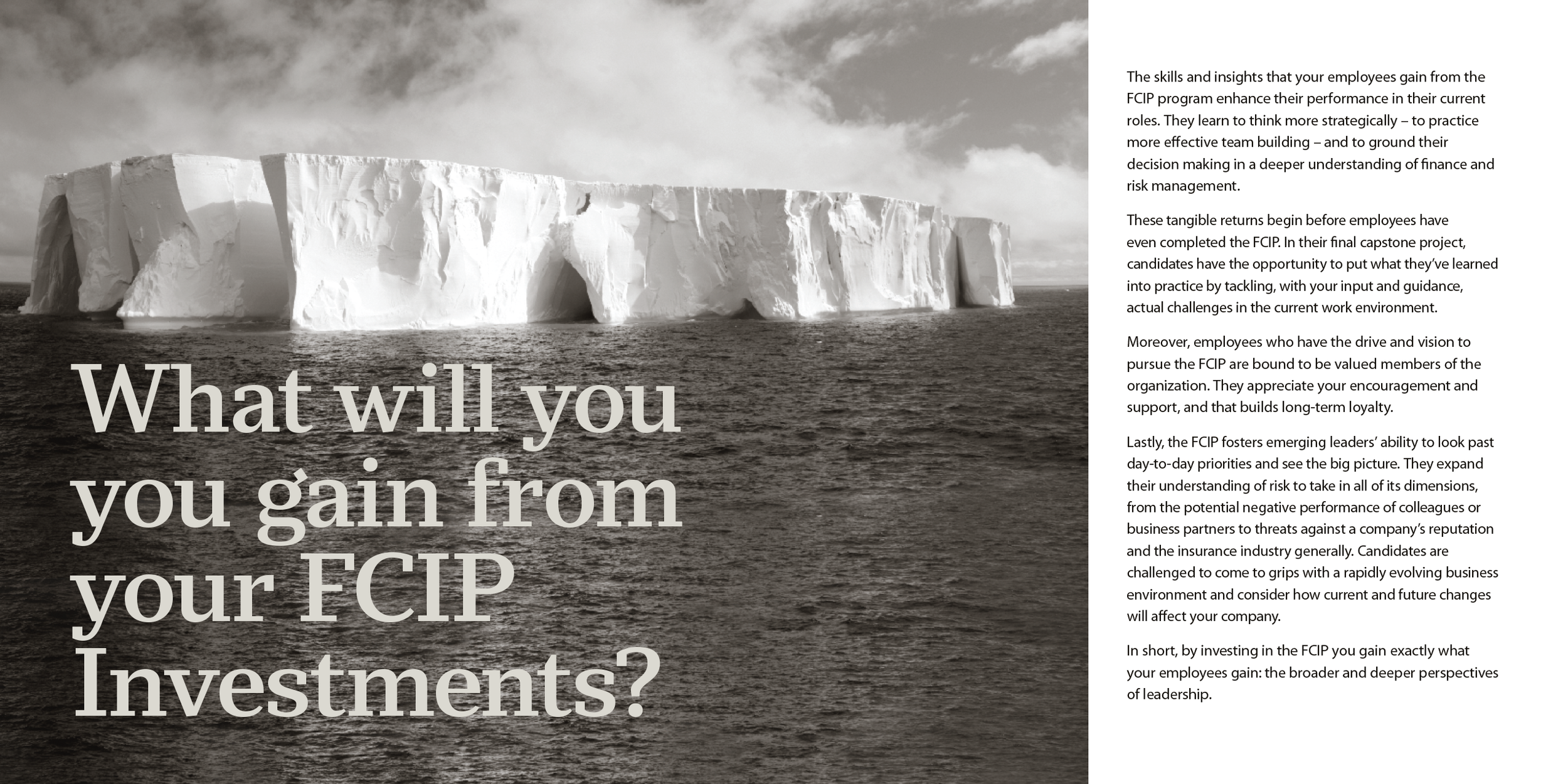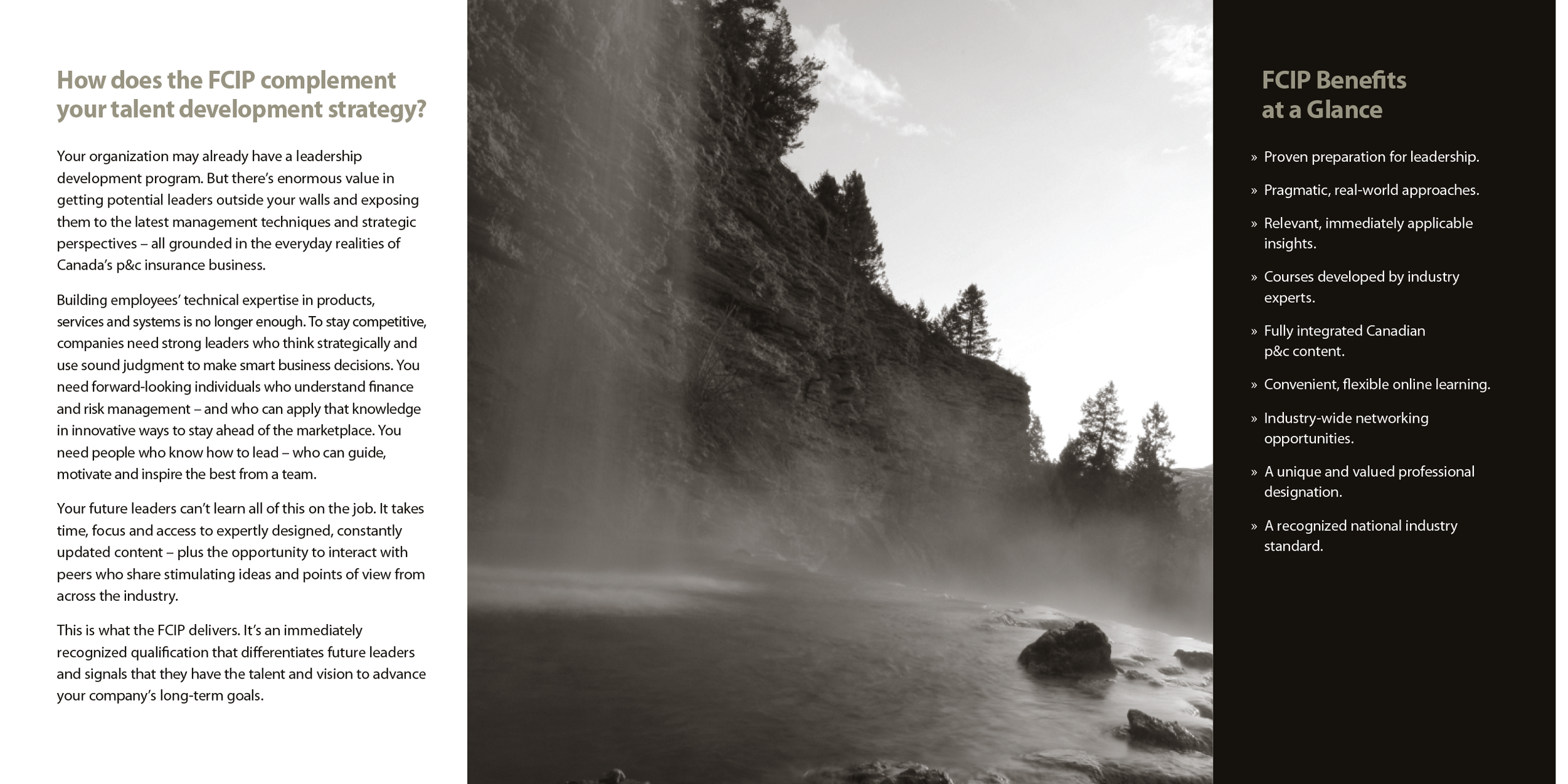 The Fellow Chartered Insurance Professional (FCIP) program is the Insurance Institute's top tier program to provide future leaders in the insurance industry with the knowledge and skill set to succeed. The FCIP program was recently retooled and re-branded with iconic imagery and colour that reflected the scope, and professionalism that the program entails. This gallery includes the FCIP company brochure I produced as well as posters and ads that were printed in Canadian Underwriter, BC Broker and other publications across Canada.