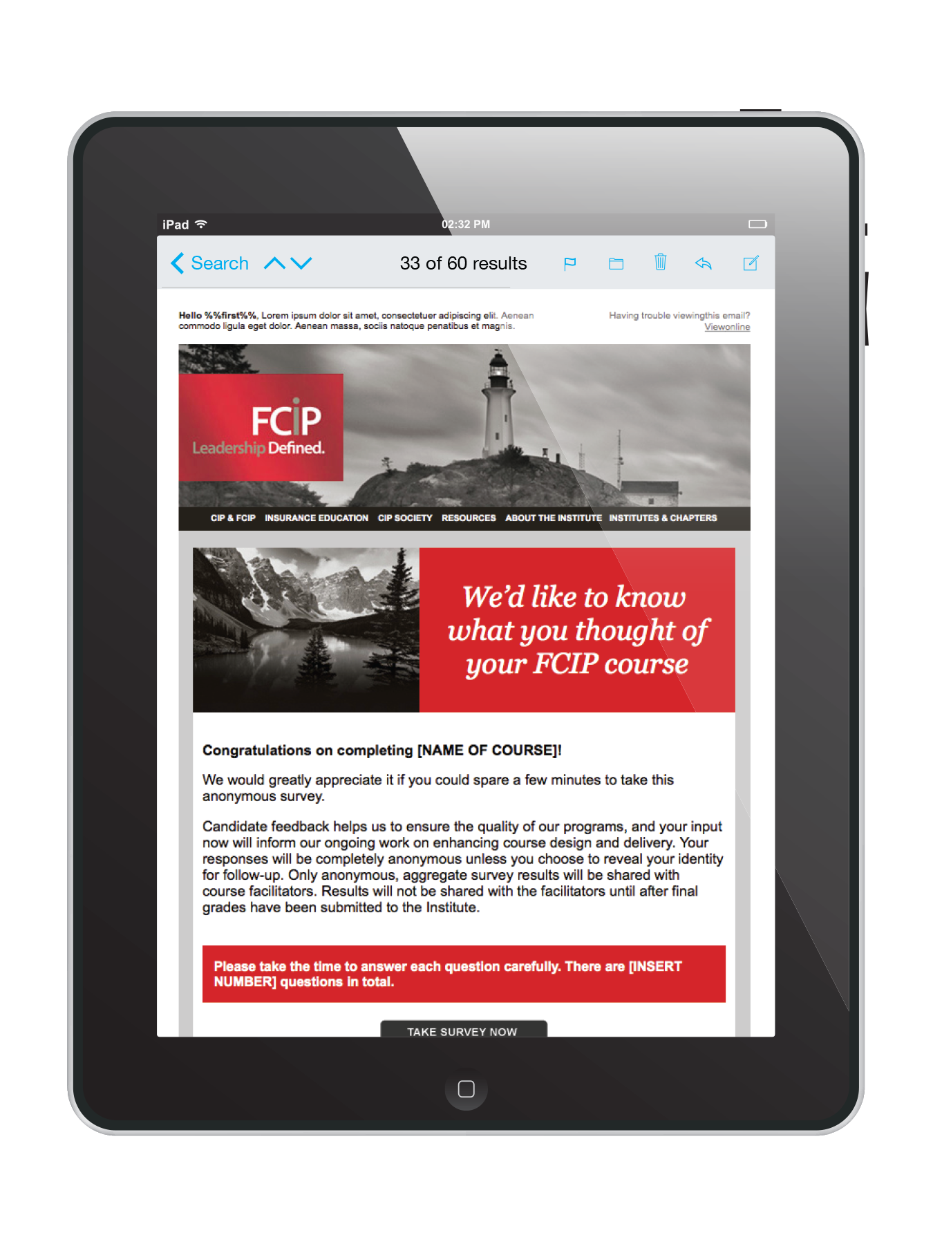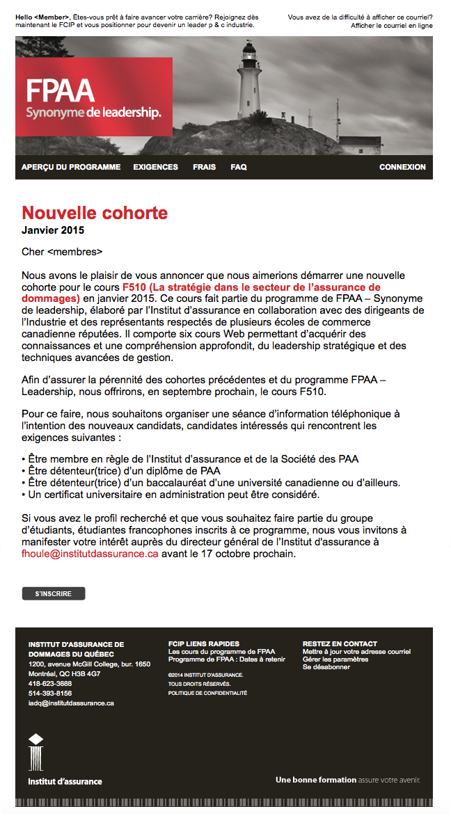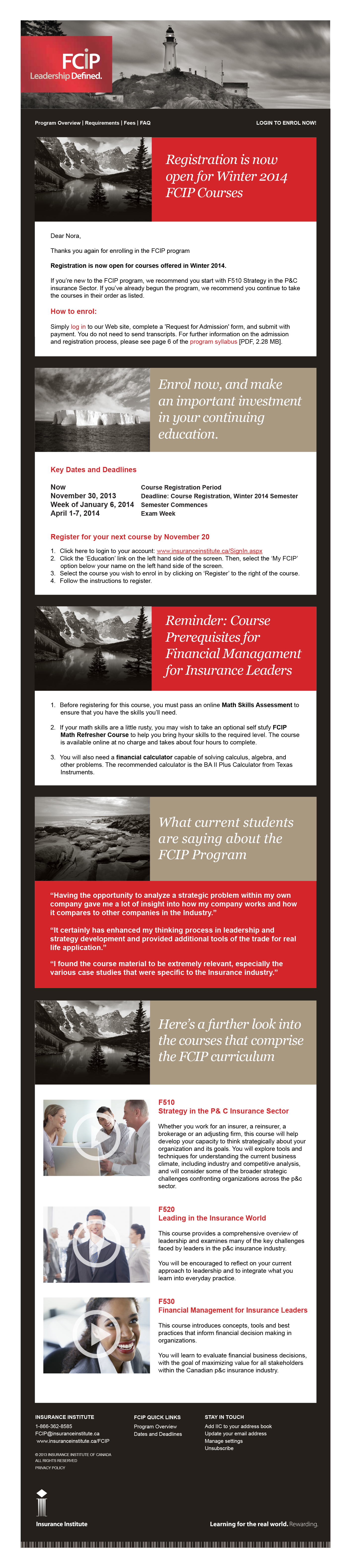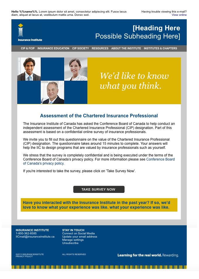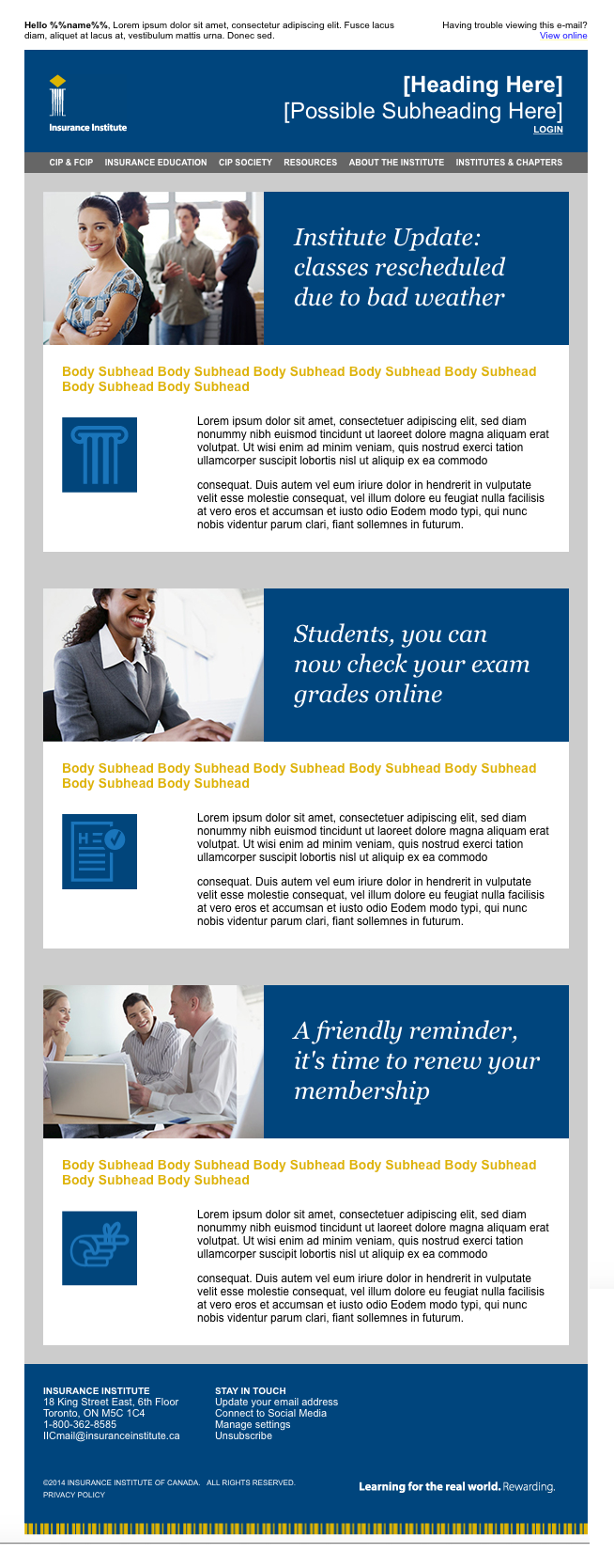 HTML e-blasts allow the Insurance Institute of Canada to connect to their members with information on courses and seminars. Additionally, it allows for critical messaging regarding course cancellations or outstanding fees while saving money on mailing costs. I created html templates for the Insurance Institute and provided html support that allowed direct messaging to be sent across Canada from remote affiliate locations.